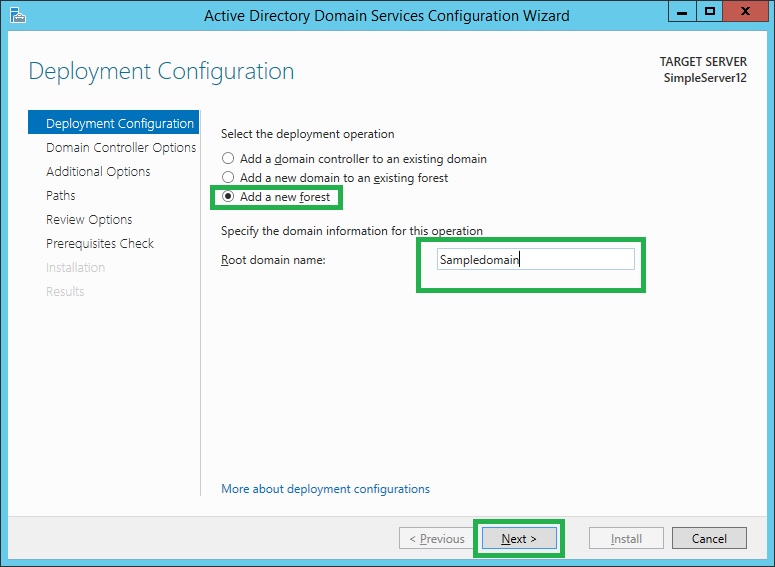 Step 14: Deployment Configuration wizard appears. Click new forest option, specify the domain information and click next.