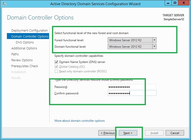 Step 15: In the domain controller option, we are able to see the forest level, the domain level and give password for Directory Service. Restore Mode and click next.