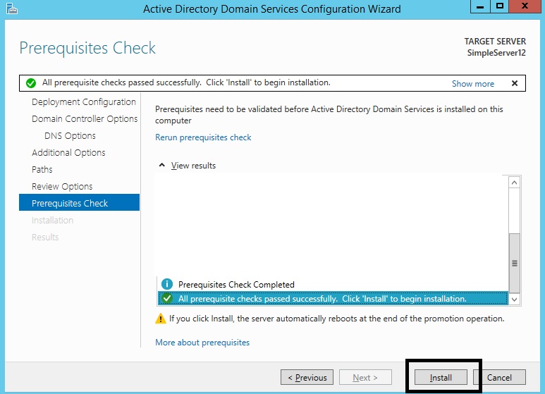 Step 20: Click install in the prerequisites wizard, after it has passed.