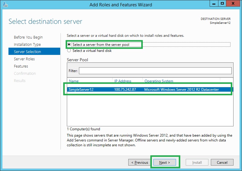 Step 5: In the Server selection wizard, choose “select a server from the pool.” In the Server pool area, it contains the name, IP Address and operating system of the desired Server.