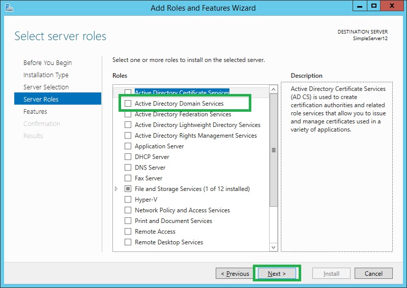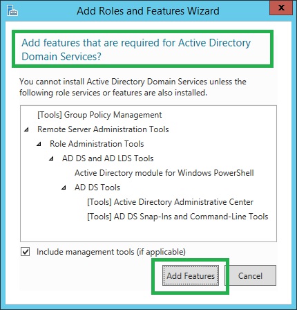Step 6: In the Server role wizard, choose “Active Directory Domain Services”. Once you click, a pop up will appear, select Add features option and click next.