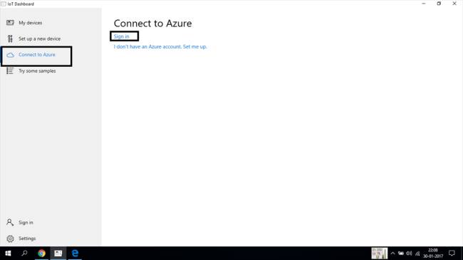 Now, click 'Connect to Azure' option and click 'Sign in' option. This will prompt you to sign into the Azure portal. Give your Azure credentials and login to the portal. Make sure to give the same Azure portal details to access the IoT hub Service, which you have already created.