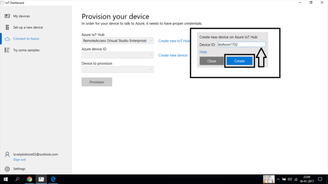 You can now even create a new IoT hub from this Window. Since we already created the IoT hub, we can make use of the same. Now, we need to create a new device ID, which will be stored in IoT hub of Azure. This will help Azure to access your device and to store the data of it in a separate directory. To create a new device ID, click on the Create new device option. Once you click on it, you will be asked to enter a new name for the device. Give some name by which you would like to register your device in Azure IoT hub and click 'Create' button.