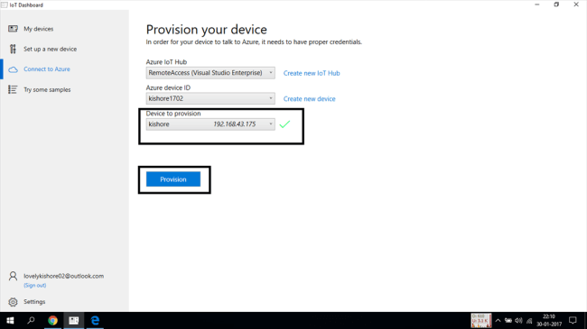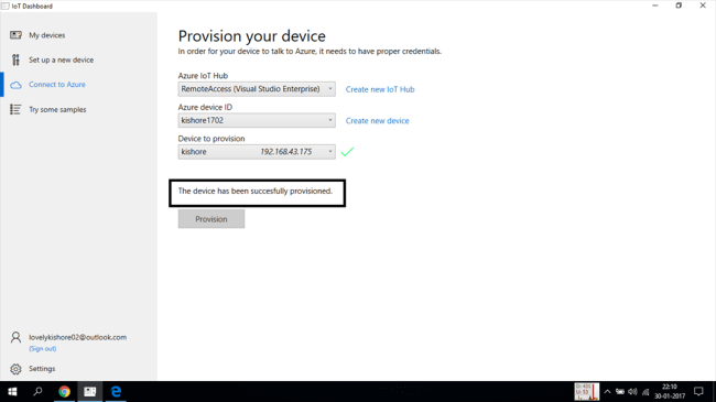 Now, a separate ID will be created for your Raspberry Pi in IoT hub in Azure portal. Now, there will be an option called Device to provision. This provisioning will register your device in IoT hub. Now, click 'Provision' button. This will take the details of Raspberry Pi to IoT hub and it will register the device in the hub. Once it is provisioned, you will be notified with a message. This indicates that your device is registered in IoT hub.