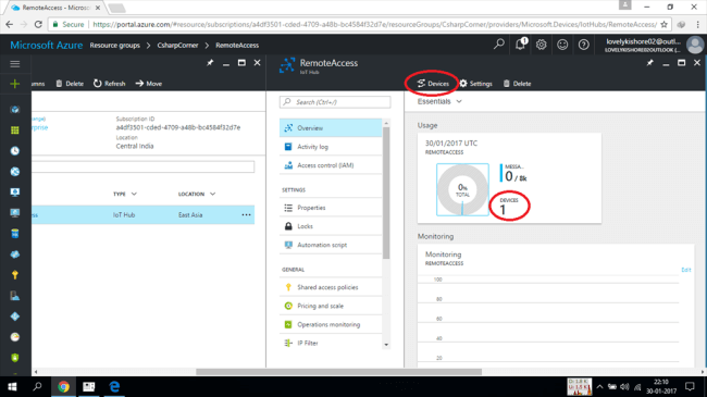 Again, open your portal and go to IoT hub Service, which you have created previously. In the beginning of this article, I have shown in a screenshot that there are no devices found in the hub. I have marked it in the screenshot. Have a look over it again, if you don’t remember. Since we have provisioned our device now, the device is already configured in IoT hub Service. You can have a look over the screenshot below to find the change. Now, if you click on the devices option in the top, you can see the set of all devices which you have connected. Since you have connected one device now, you will see only one. The usage meter given below will measure the amount of data, which is sent and received. You can find the connection string from the device option too.