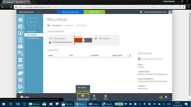 Here, you can find the Gateway IP address for “fero_vnet_eu”. Gateway IP address: 52.169.124.111