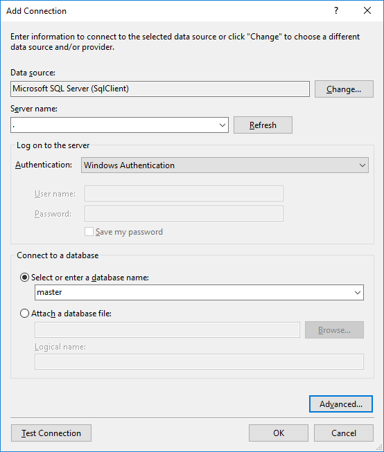 Select Authentication. (Again, since it's local, I’ve selected Windows Authentication.). Selecting SQL Server Authentication, you can enter username and password.