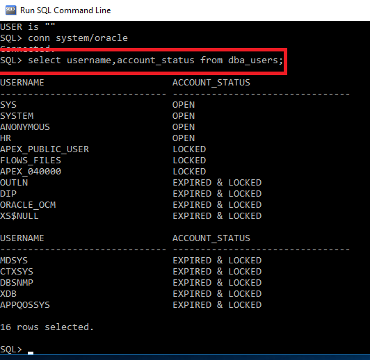 Now to list out the number of usernames available by default inside our database we type the following below code in the SQL command line and find the list and its account status.