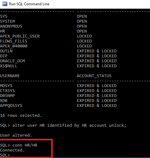 After altering the username, now we have to connect using the command conn HR/HR.