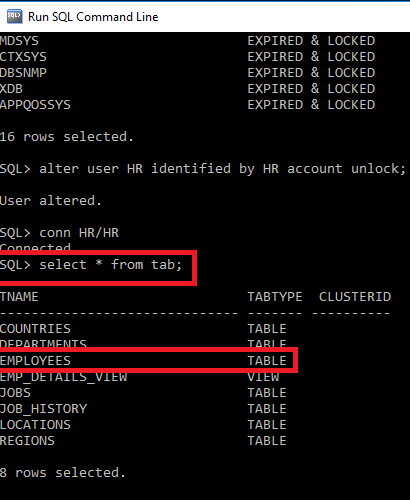 Since the username is connected, now we will see the default available tables inside the database which is supposedly filled with data where the user can work on. To do that, type the command displayed in the picture given below. Here, we are going to select the table EMPLOYEES which has some data.