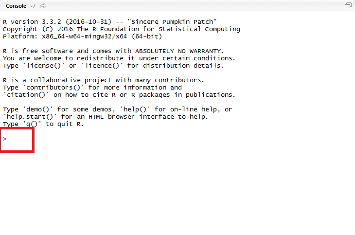 Inside RStudio, you will get workspace called the Console where you have to again type the commands of R to execute your logic. The below picture shows the R environment. The greater than (>) symbol shows the starting place of typing the command.