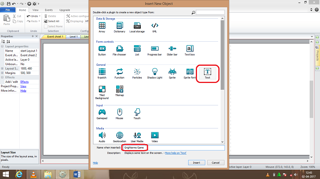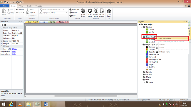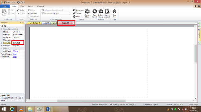 An empty layout will be displayed and now we need to change the size of the layout in layout properties and the layout size must be (1800,480 ) and a new layout sheet must be again added and named as game event.