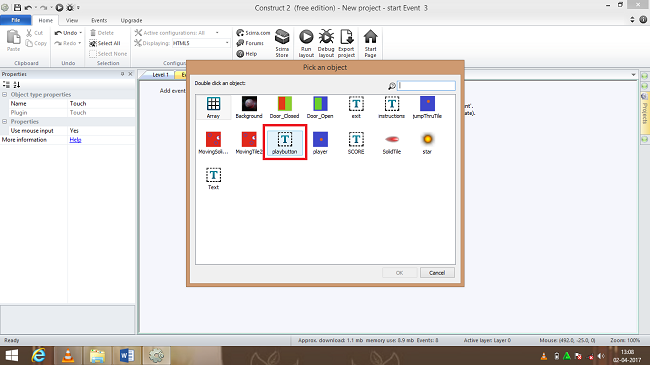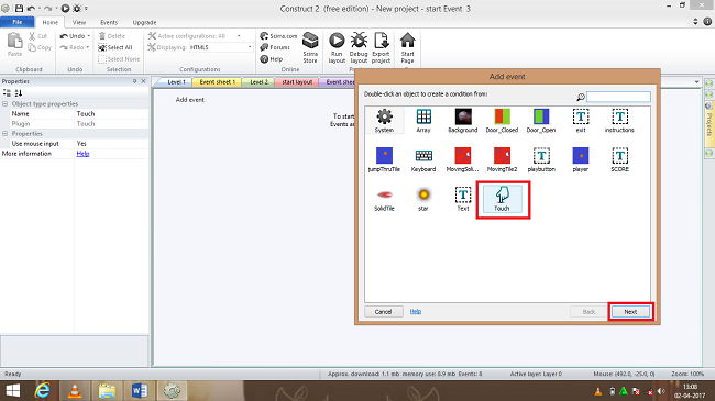 Now again double click->event sheet and a window box will appear and select touch object, after inserting on touch object and click->next