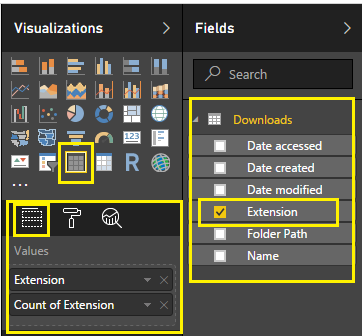 I want to show file count by extension. So, I will use the table visual.