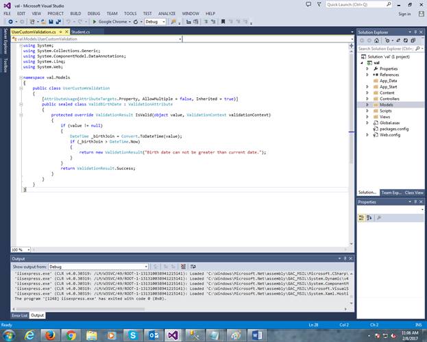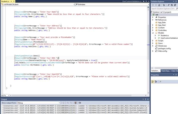Here, UserCustomValidation is the name of the Model Class and ValidBirthDate class is the child class of ValidateAttribute base class.