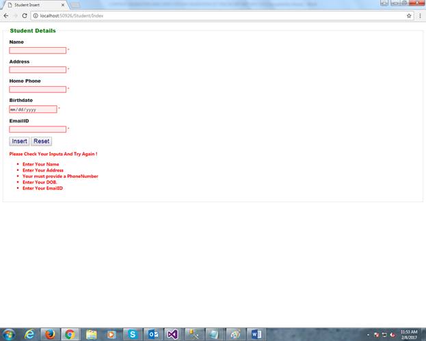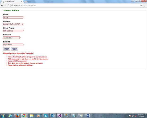 Here is the output for the selected controls validation message instead of ALL. I entered Invalid data for Home Phone , Birth Date and Email ID, so validation message will appear as shown below.