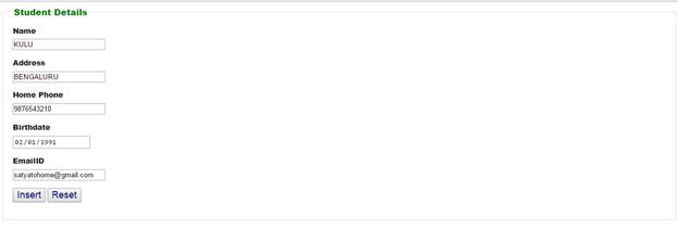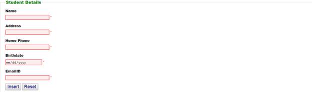 Here, I need to use validation message which will be shown for this entity. Here, I used asterisk symbol which will be shown on the right hand side of control validation. Like above mentioned control, I used the same method for other controls for validation purposes. Subsequently, I used Submit and Reset button