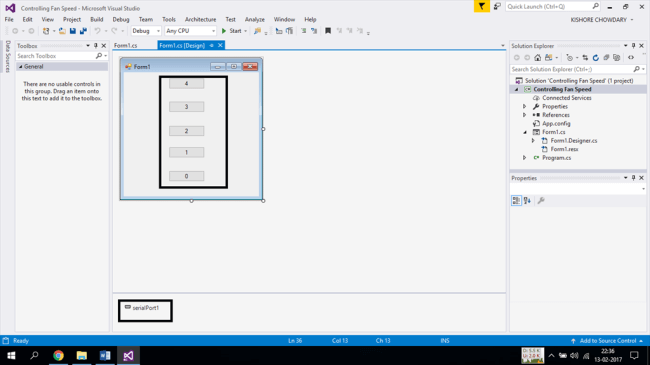 The next step is to design an Application in Visual Studio to send the commands to Arduino to execute the program. Open up your VS and create a new Windows Forms Application. Subsequently, add 4 buttons to the main page. Name them accordingly and then double click on them to add button click event handlers for them. Also, add a serial port tool from the tools box to communicate with Arduino. If you are very new to Arduino programming, using VS, you won’t understand all these. Thus, I suggest you read the articles from the links given above, if you are new. For each button, you will be using a separate acknowledgment, which will be sent to Arduino. Your design and code will be, as shown below.
