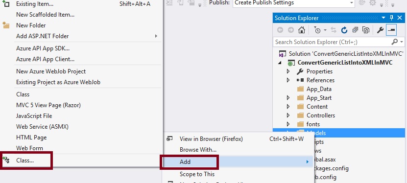 Now let us create the model class file named CustomerModel.cs by right clicking on model folder as in the following screenshot: