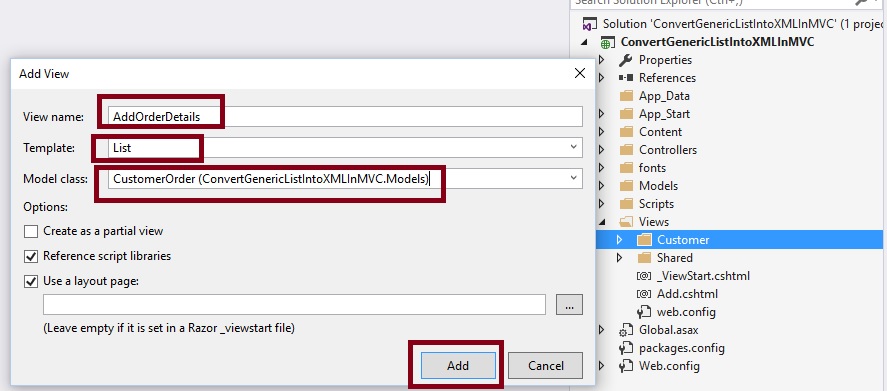 Creating strongly typed view named AddOrderDetails using CustomerOrder model. Right click on View folder of created application and choose add view, select CustomerOrder model class and scaffolding List template as,