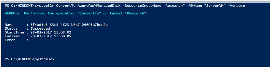 Note that, in order to perform this disk conversion, the virtual machine needs to be turned off. If the command is run directly on a running VM, it throws an exception clearly mentioning that the operation cannot be performed since the VM is not deallocated.