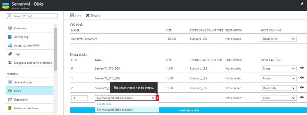 For adding new disks, we simply need to select the VM and select Disks option from the settings blade and click on Add data disk option.