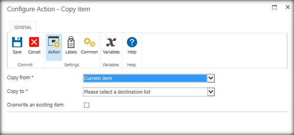 This will open up Nintex Workflow designer. We can select the actions from the left pane. Add the ‘Copy Item’ action to the form.
