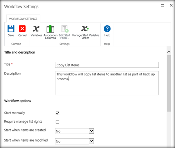Here, we are setting it to ‘Start manually’, so that the Workflow can be triggered, as required.