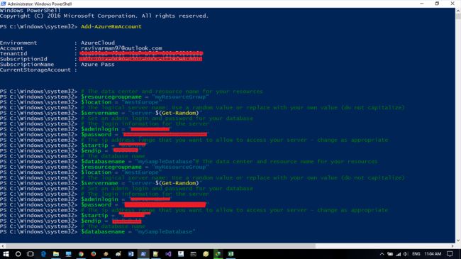 Now, we need to login into Azure subscription by using Windows Azure PowerShell. I have provided Azure PowerShell commands. Login into Azure, using command script. You can change the admin name, password etc.