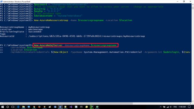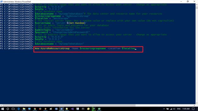 - New-AzureRmSqlServerFirewallRule -ResourceGroupName $resourcegroupname `