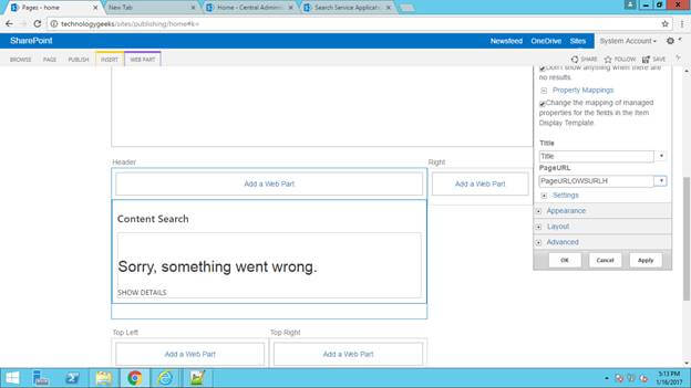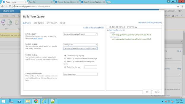 Click OK. Under property mapping section, map the managed properties of the title, image description, and image.