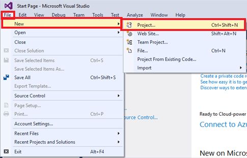 Open Visual Studio 2015 update 3 and click File >> NewProject and open the new window. Or, use the shortcut keys - Ctrl+Shift+N.
