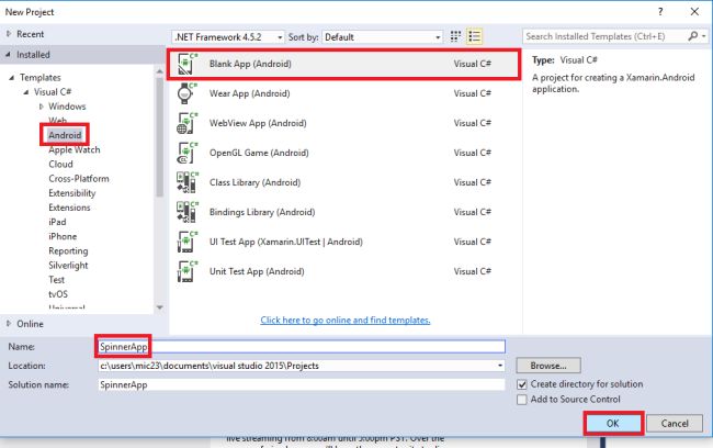 Step 2Now, open the New project and go to the Visual C# . Click Android, then choose the BlankApp (Android). Now, write the application name and click on OK button.