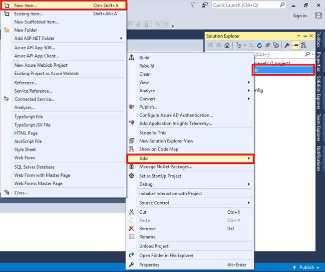 Now, open the project and afterwards, you can go to project. Right click and select Add. Choose the New item or those which follow the shortcut keys Ctrl+Shift+A.