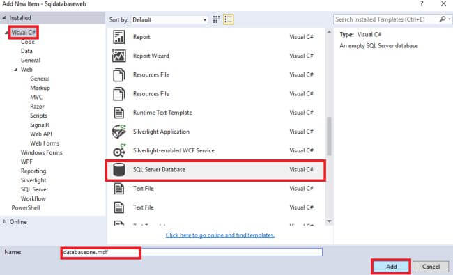 Here, go to your project, click the right click and choose the add. Afterwards, choose the New Item. Now, select the Visual C# and select SQL Server database and write the Server name. Click the "Add" button.
