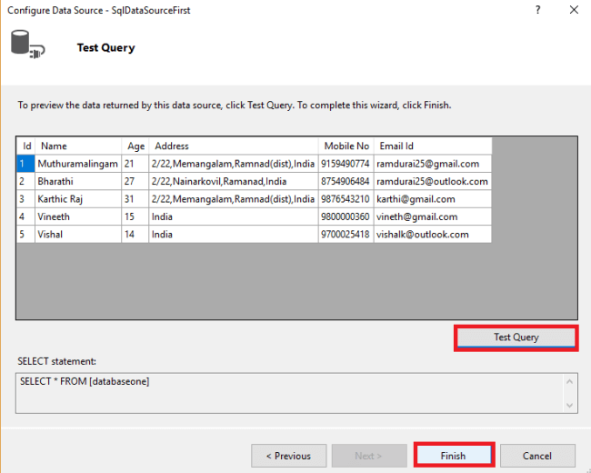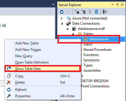 Now, go to Server Explorer and click the table (databaseone). Right click to open the Window and afterwards, you can click the Show table Data.