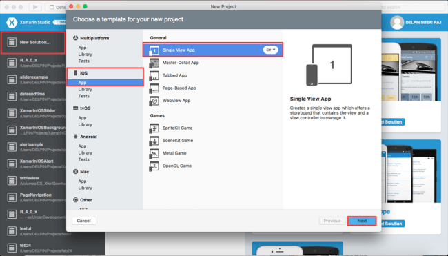 Click New Solution—> select iOS—>select App--> Choose single View app. Afterwards, click Next.