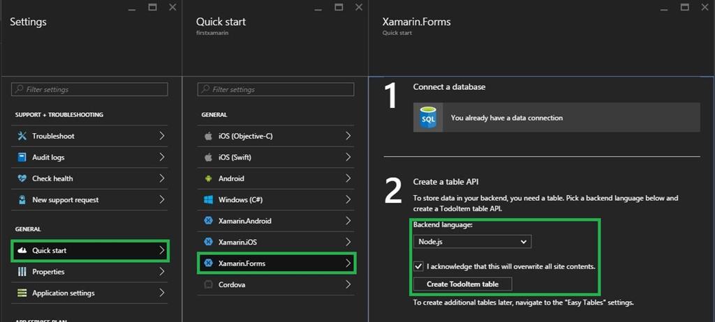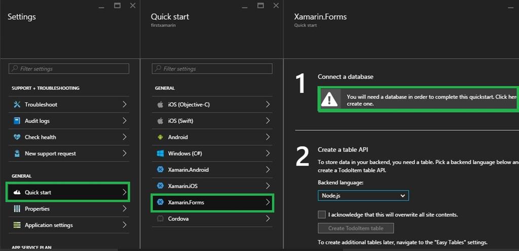 Step 4: In the Settings blade for the new Mobile App backend, click Quick start > your client app platform (Xamarin.Forms) > Connect a database,