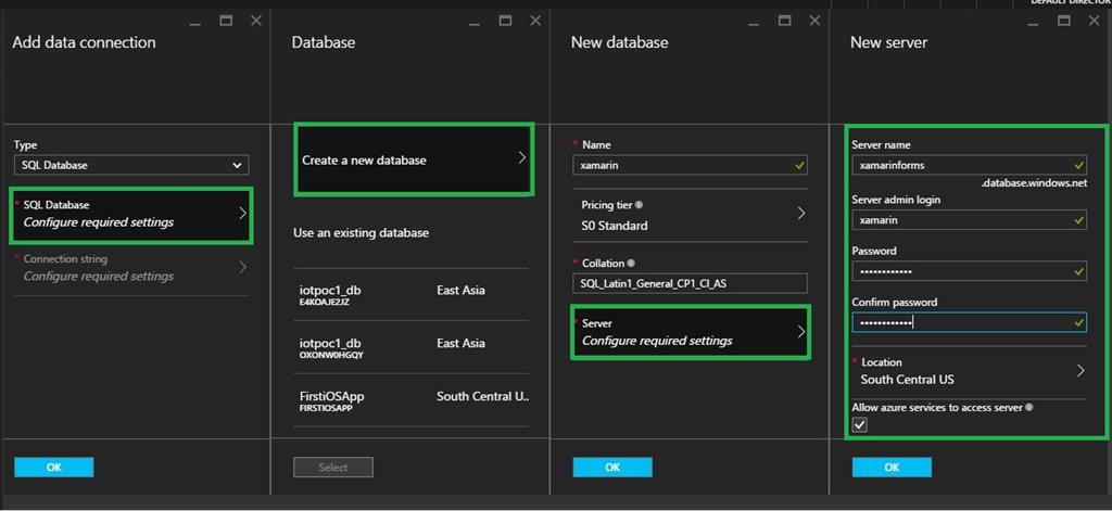 In the Add data connection blade, click SQL Database, then create a new database, type the database Name, choose a pricing tier and then click Server and New server blade, type a unique server name in the Server name field, provide a secure Server admin login and password.