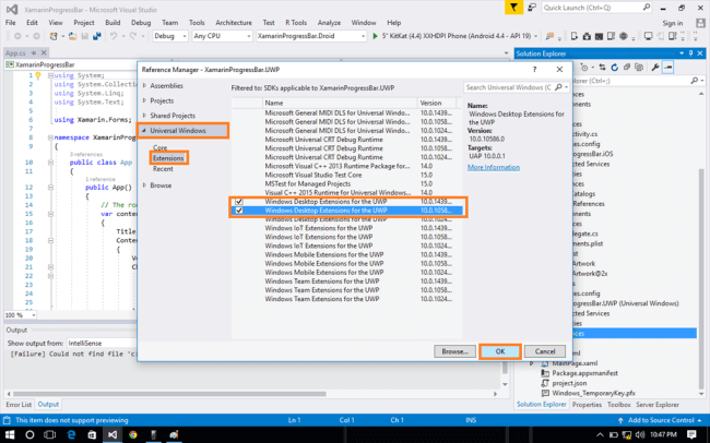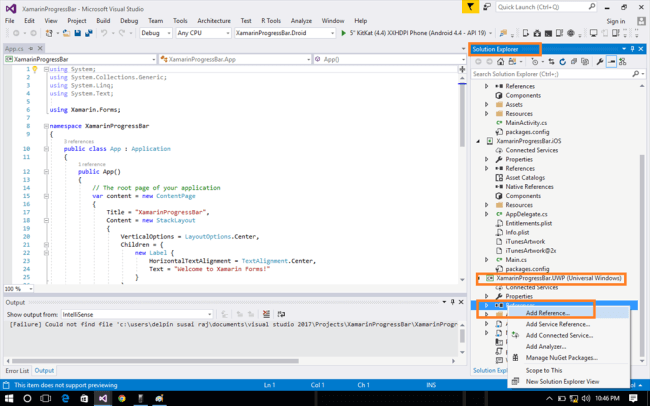 Now, go to Solution Explorer. In Solution Explorer, get all the files and source in your project. You can add Universal Windows Platform (UWP). In Reference, go to Solution Explorer-->Your Project-->UWP-->Reference-->Right Click --> select Add reference.