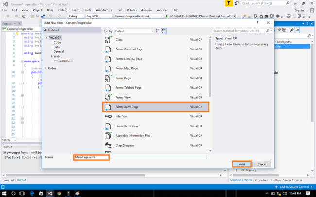 In this step, add one page, whose name is called MainPage.xaml. Go to Solution Explorer-->Your Project-->Portable-->Right click-->Add-->New Item (Ctrl+Shift+A).