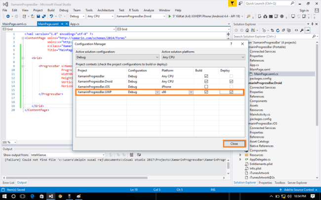 Now, you can run your app. Go to the Debug configuration Manager. Choose platform, check build and deploy option. Afterwards, click close.