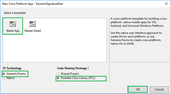 Choose Blank App and select Xamarin.forms and PCL (sharing) as shown in below screenshot. Afterwards, click OK.