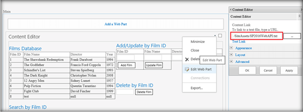 Add the Script to SharePoint The entire script along with the applied style is available for download in this article with the name ‘SP2016WebAPI.txt’. Upload it to the SharePoint repository ‘Site Assets’. Copy the file path and assign it to the Content Link section of a Content Editor Web Part. Once done, click on Apply. We can see the CRUD web part available in the page.