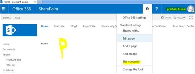 - Open SharePoint Blog page, select setting menu and select site contents options.