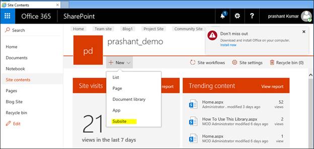 - Here, we need to select Subsite by clicking New on site content page, as shown below.