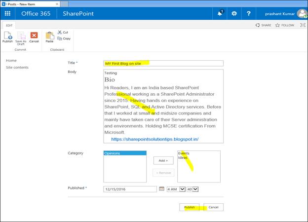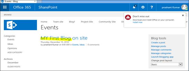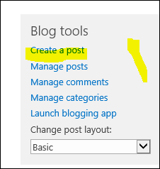 - On the home page of the SharePoint Blog page, select create a Post under the Blog tools.