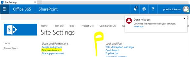 - Select site permission under the Users and Permissions option, as shown above. It will take us to site permissions.