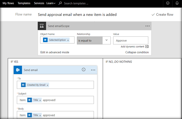 So in the ‘emailScope’ action, check if the Value is ‘Approve’. If so, we will send an approved mail to the creator of the list item saying the item is approved as shown below.