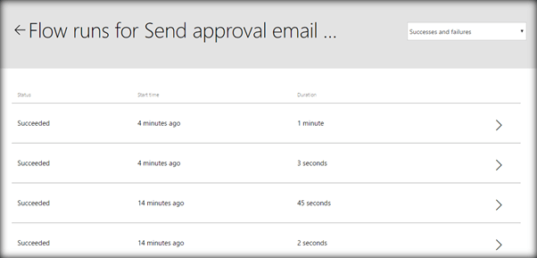 The inverted exclamation mark will give the recent runs of the flow and the details if we click on it.